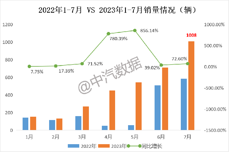 2023年1-7月,除2月销量略有下降,总体销量呈快速增长态势,且相较2022年同期,各月份均实现不同程度的增长。